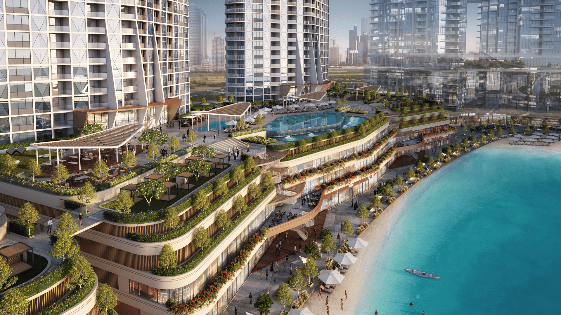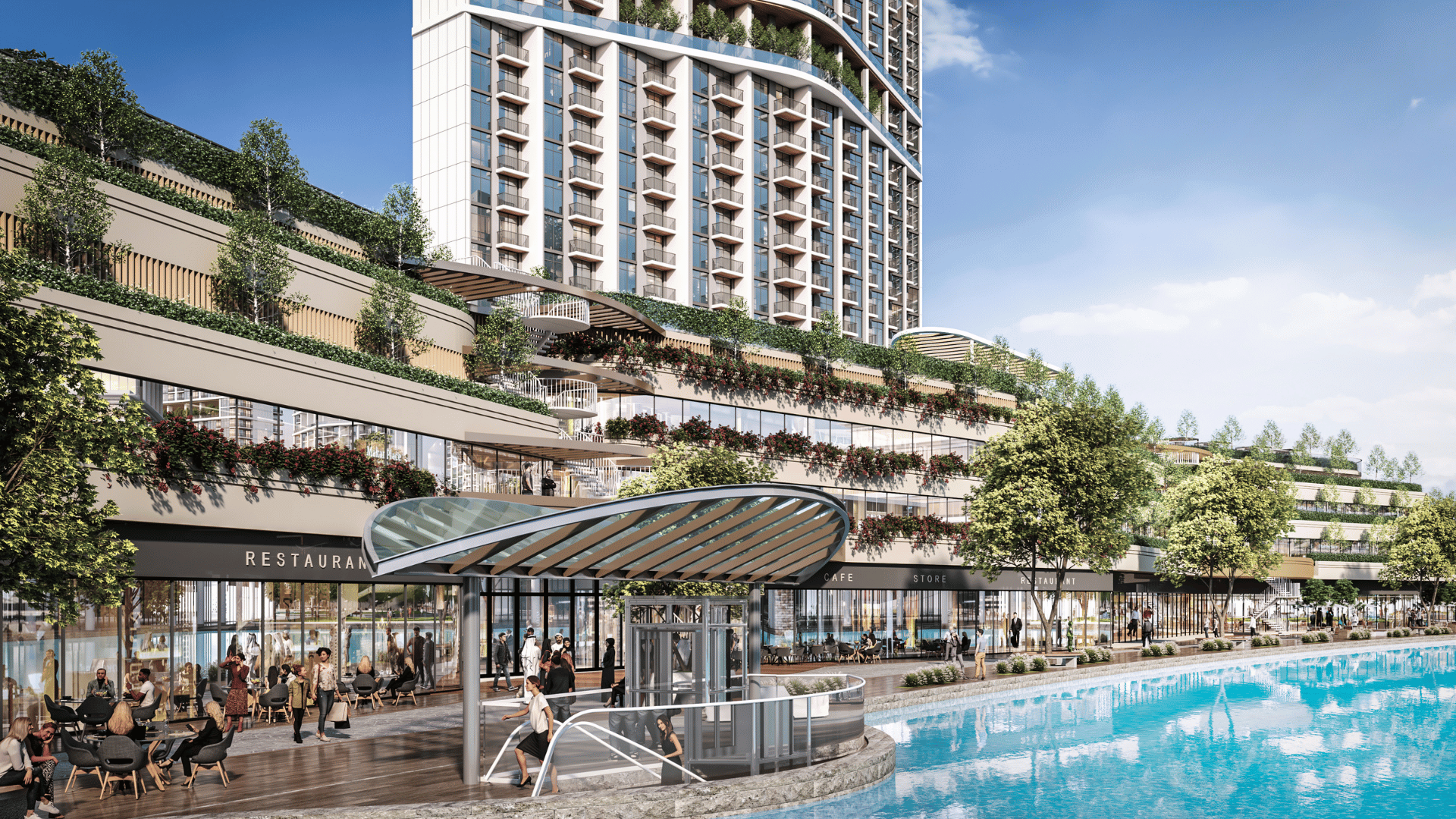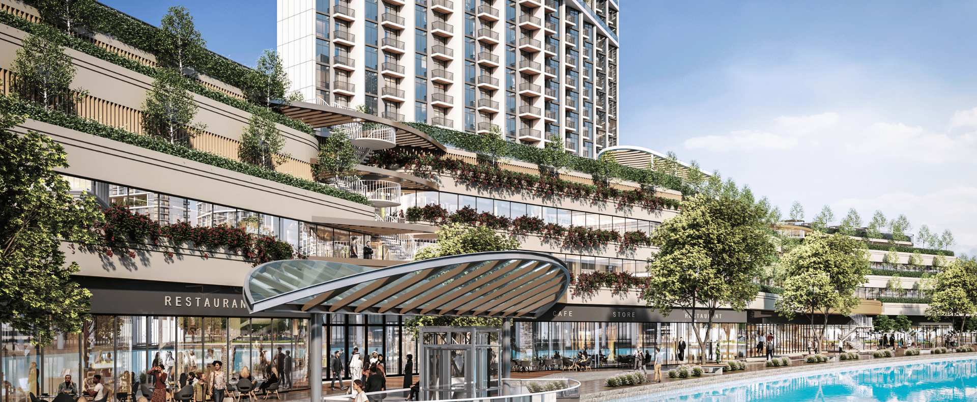 Amenities: Same rich podium + tower set as the district (pools, gyms, yoga zones, kids’ areas, BBQ, library, cinema) + Sky Gardens (L19, L48); wide community sports & water attractions.