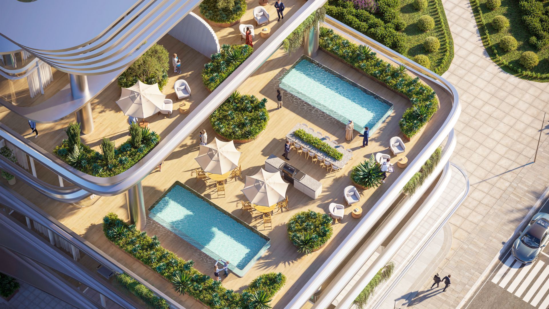 Design: Italian-inspired interiors with brands such as Minotti, Terzani, Gessi, Teka, and Technogym