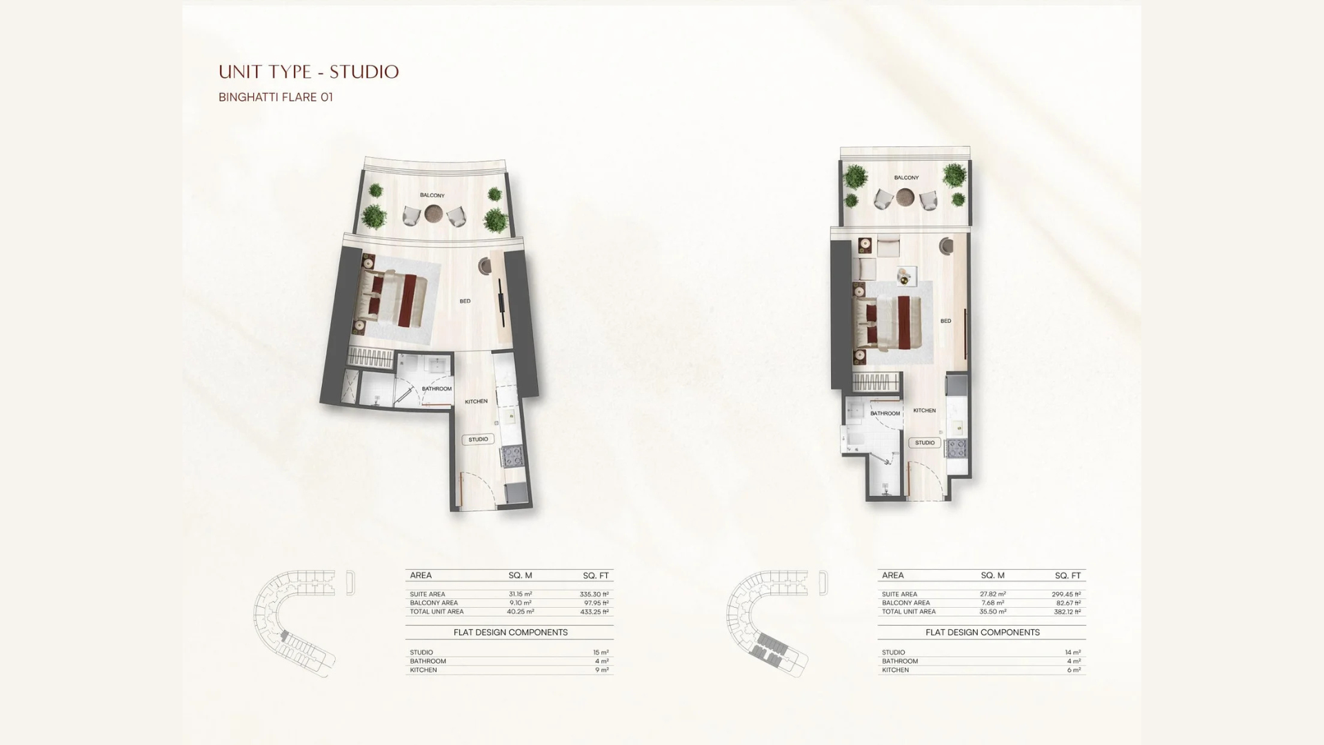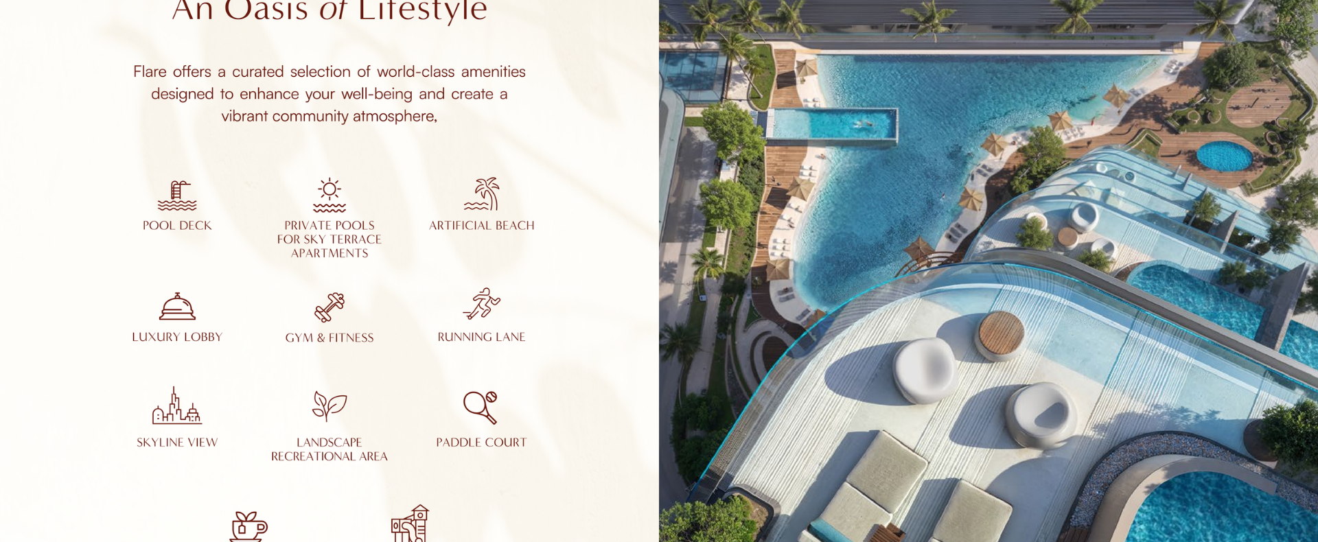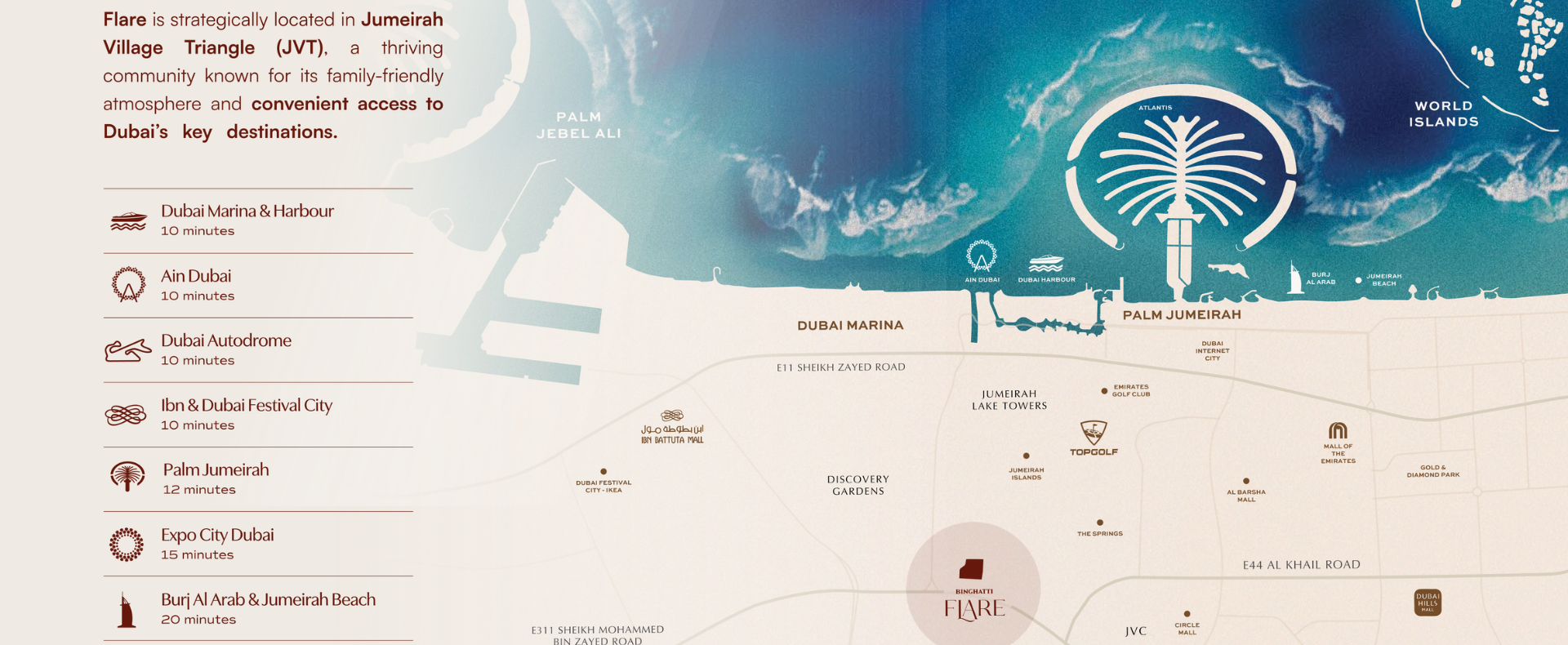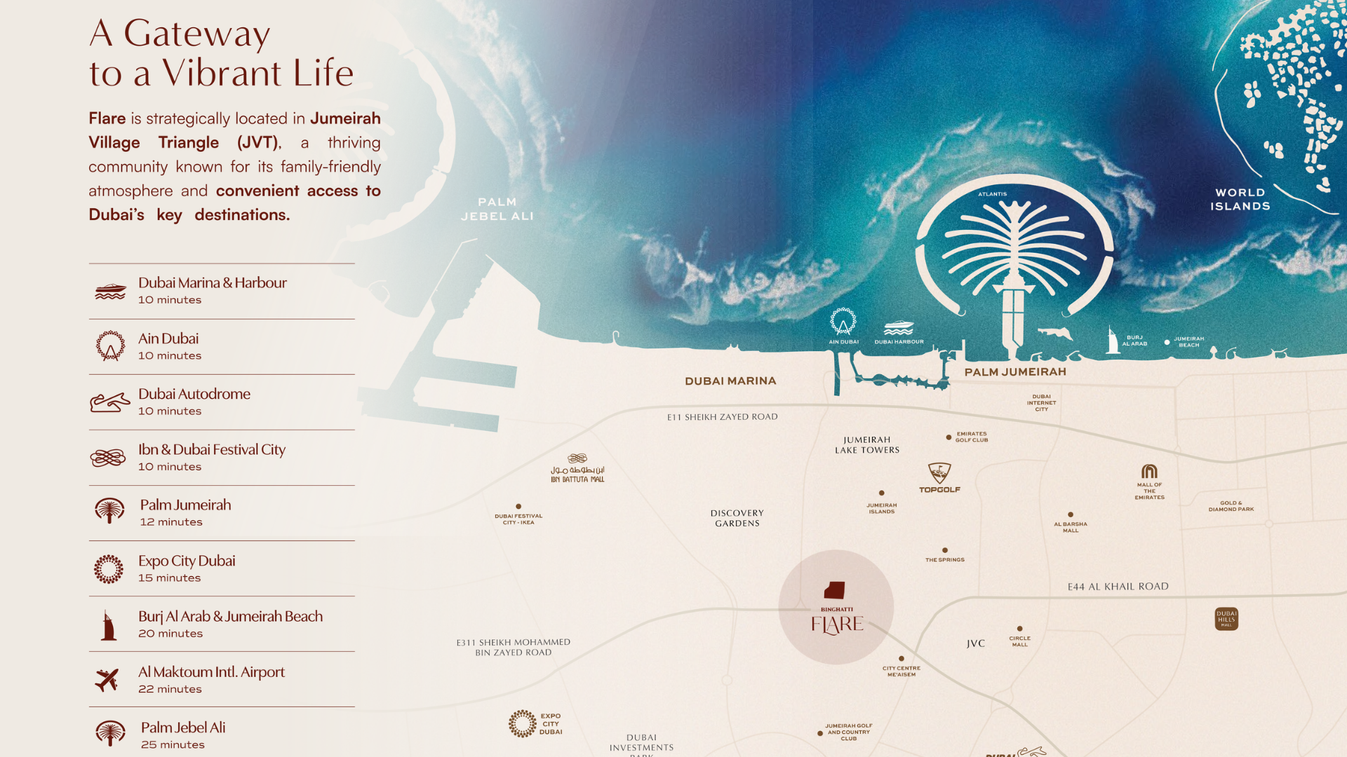Binghatti Flare in Jumeirah Village Triangle (JVT) offers a premium selection of studios, 1-, 2-, 3-, and 4-bedroom apartments starting from AED 800,000. Units range from approximately 382 sq ft (studios) up to 2,726 sq ft, featuring European-inspired finishes, smart designs, and private balconies. Located in a quiet yet well-connected neighborhood, residents are only 10 minutes from Dubai Marina, Palm Jumeirah, and Downtown Dubai, and 22 minutes from DXB Airport.