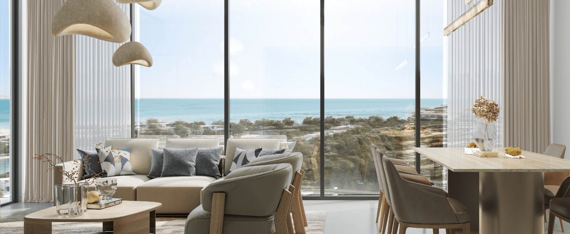 Delphine Beach Residences offers studio to 3 BR beachfront apartments starting at AED 1.12M, with delivery anticipated in Q4 2027. It’s a serene beachfront residential enclave within the lush surrounds of Siniya Island.
