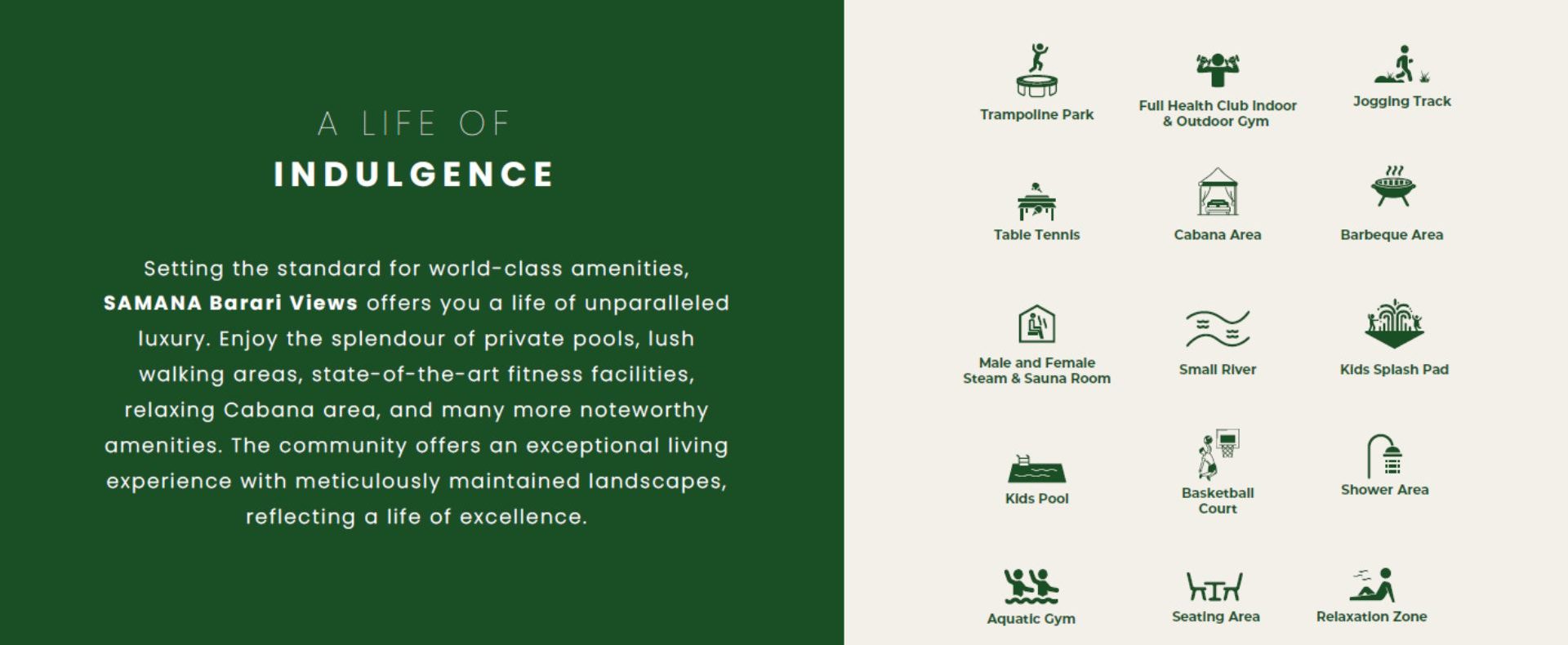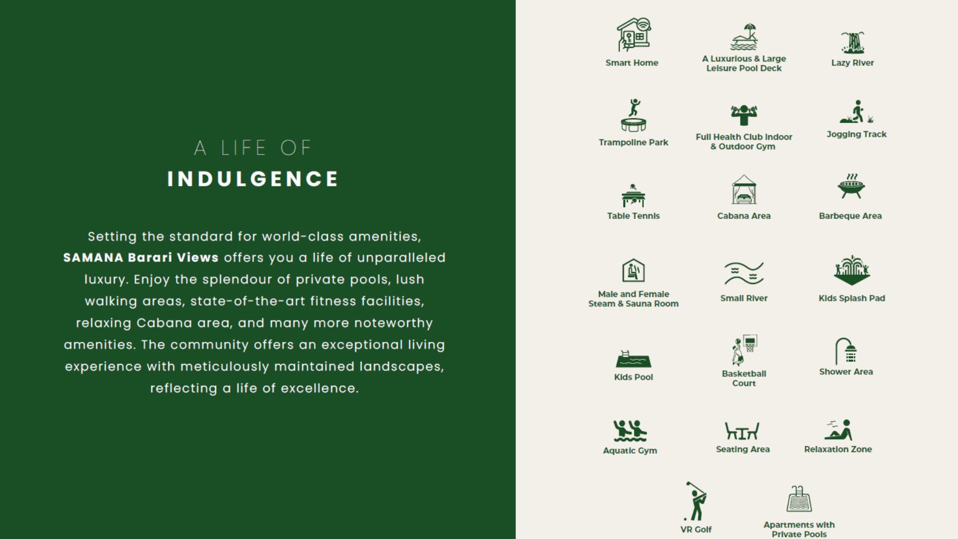 Residents enjoy an active lifestyle with leisure decks, sauna & steam rooms, rooftop jogging park, outdoor cinema, fitness center, and children’s play zones amidst serene green surroundings near Al Barari.